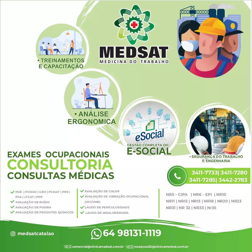 A MEDSAT é uma empresa de Medicina e Segurança do Trabalho que há 28 anos presta serviços na cidade de Catalão-GO e região. Comprometida em levar a seus Clientes excelência, profissionalismo, competência e ética, é referência em elaboração de documentos e laudos exigidos para envio ao e-Social.